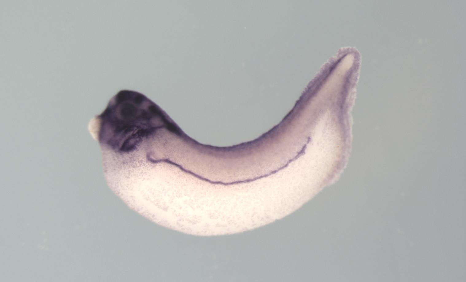 Larger Image tfap2a (tto transcription factor AP-2 alpha) gene expression in Xenopus laevis embryo, assayed via in situ hybridization, NF stage 33 & 34, lateral view, anterior left, dorsal up. Copyright © Soeren S Lienkamp Image created by: Soeren S Lienkamp