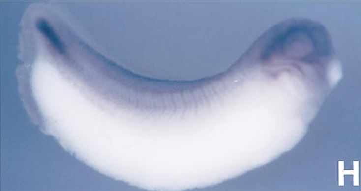 Larger Image fstl1 (follistatin like 1) gene expression in Xenopus laevis embryo, assayed via in situ hybridization, NF stage 29 and 30, lateral view, anterior right, dorsal up. Image published in: Okabayashi K et al. (1999) Copyright © 1999. Image reproduced with permission of the Publisher.