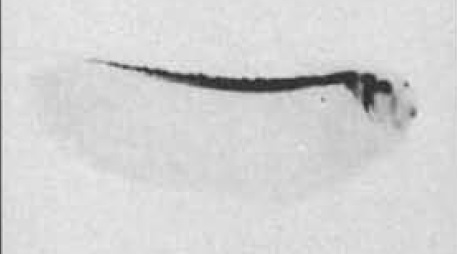 Larger Image gap43 (growth associated protein 43) gene expression in Xenopus laevis embryo, assayed via in situ hybridization, NF stage 26, lateral view, anterior right, dorsal up. This image is extracted from figure published in: Shain DH et al. (1995), Image published in: Shain DH et al. (1995) Copyright © 1995. Image reproduced with permission of the Publisher.
