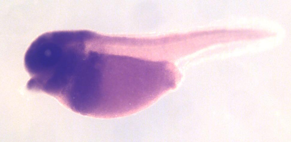 Larger Image gatd1 (glutamine amidotransferase class 1 domain containing) gene expression in X. laevis embryo, assayed via in situ hybridization, NF stage 35 & 36, lateral view, anterior left, dorsal up. Copyright © Perron Lab