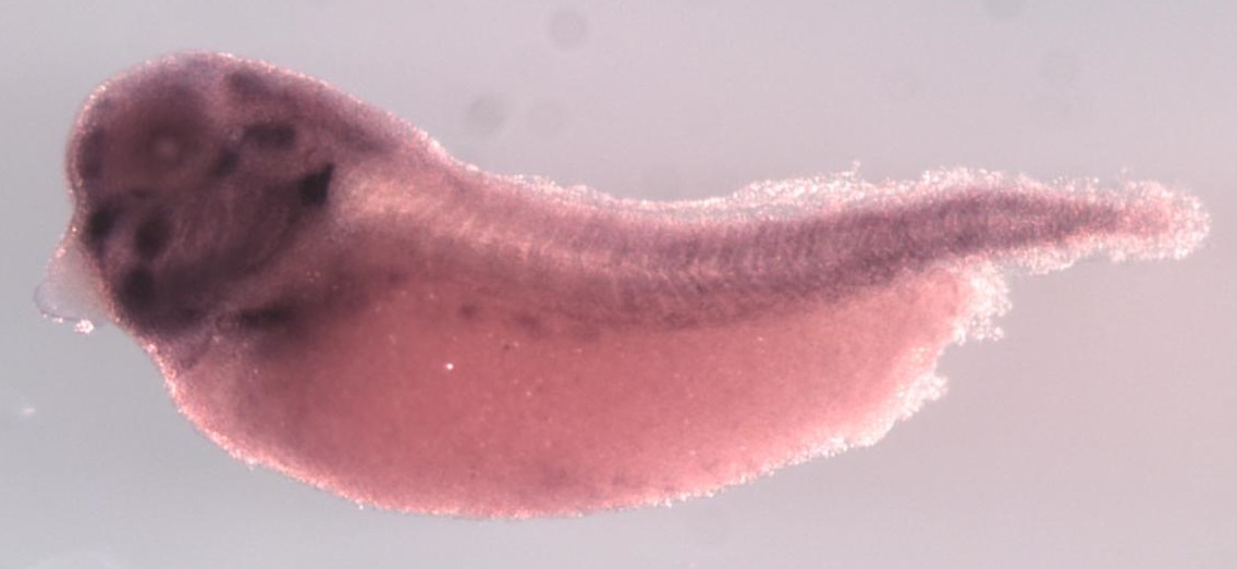 Larger Image pdk1 (pyruvate dehydrogenase kinase 1) gene expression in X. laevis embryo, assayed via in situ hybridization, NF stage 35 & 36, lateral view, anterior left, dorsal up. Copyright © Perron Lab