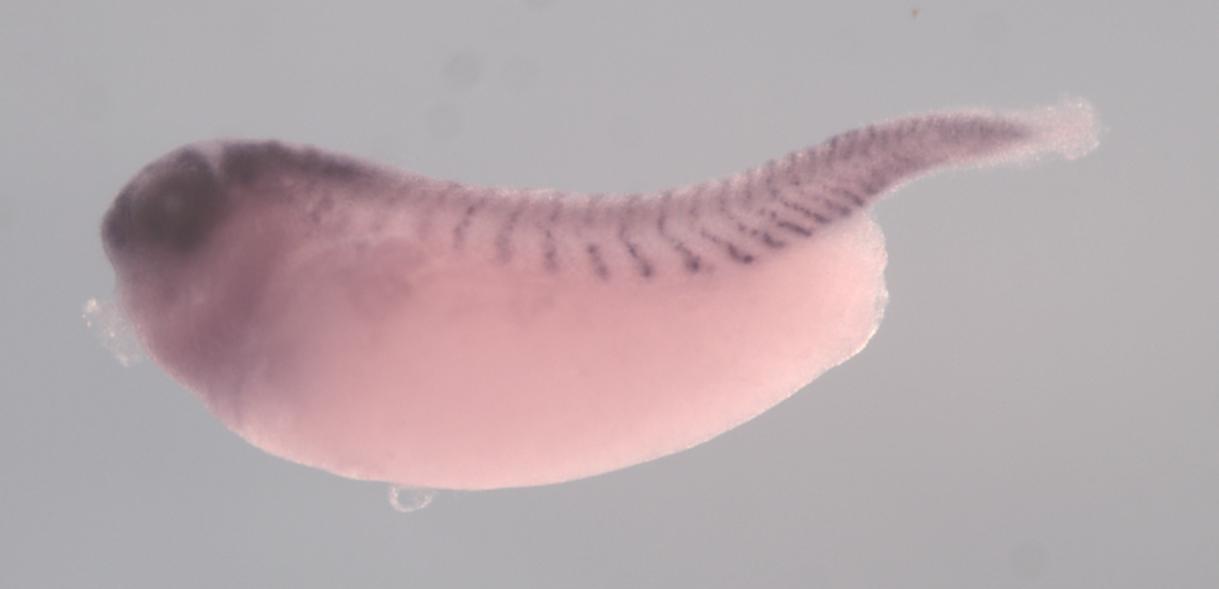 Larger Image phka1 (phosphorylase kinase, alpha 1) gene expression in X. laevis embryo, assayed via in situ hybridization, NF stage 35 & 36, lateral view, anterior left, dorsal up. Copyright © Perron Lab