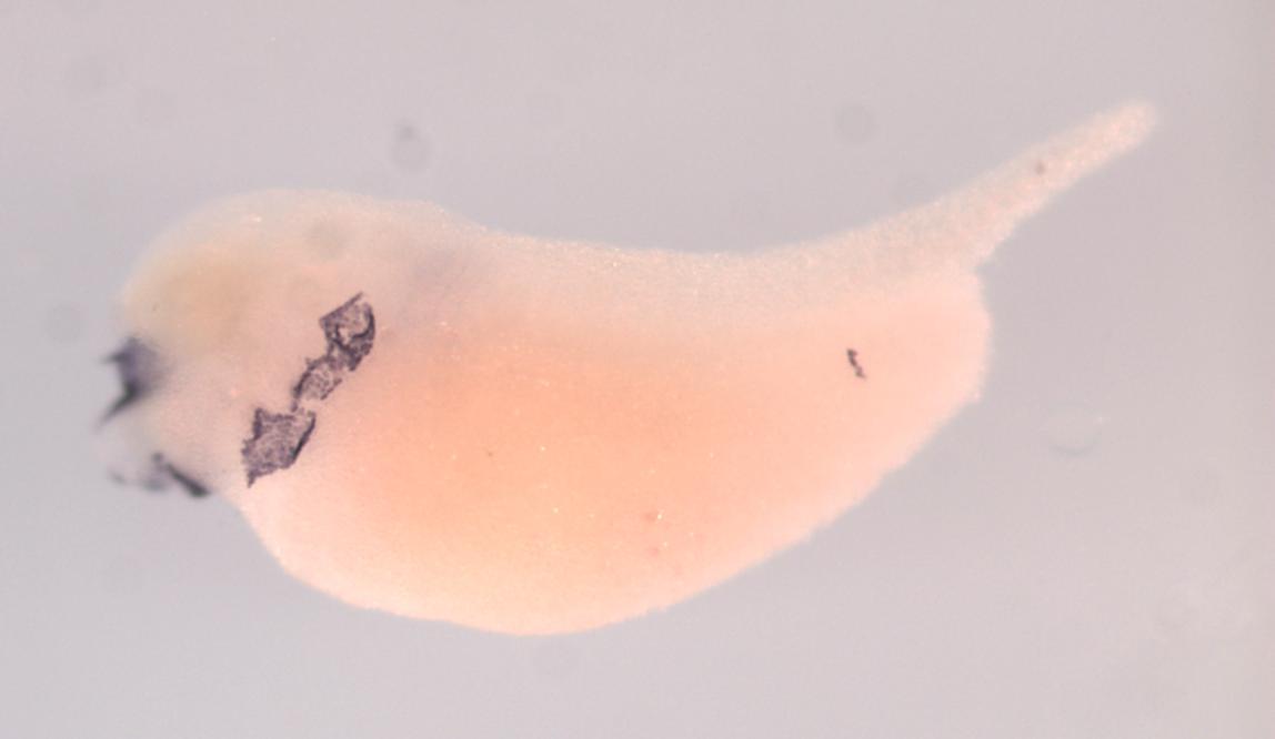 loc733495 (novel protein similar to X-epilectin) gene expression in X. laevis embryo, assayed via in situ hybridization, NF stage 35 & 36, lateral view, anterior left, dorsal up.