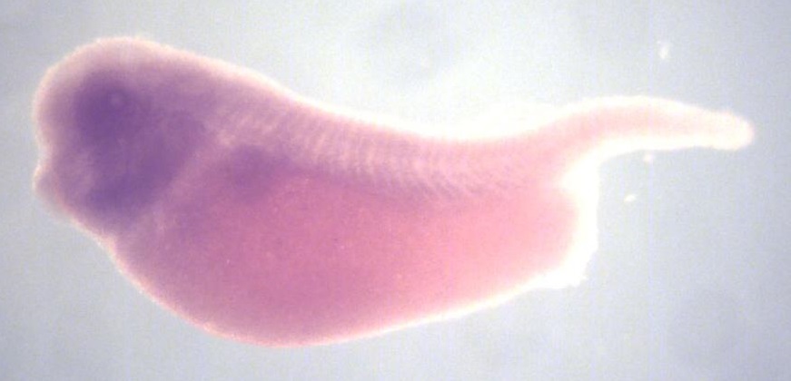 Larger Image slc49a4 (solute carrier family 49 member 4) gene expression in X. laevis embryo, assayed via in situ hybridization, NF stage 35 & 36 lateral view, anterior left, dorsal up. Copyright © Perron Lab