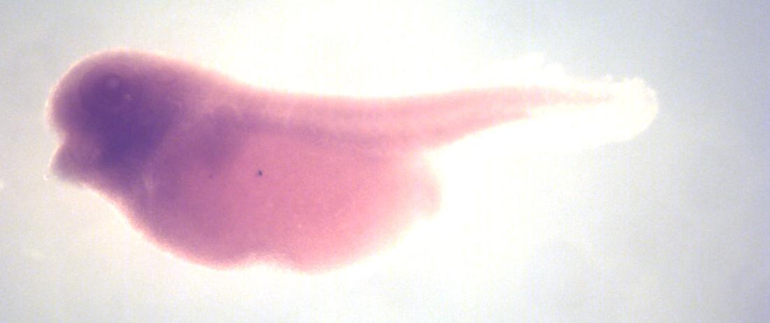 osbpl9 (oxysterol binding protein like 9) gene expression in X. laevis embryo, assayed via in situ hybridization, NF stage 35 & 36, lateral view, anterior left, dorsal up.
