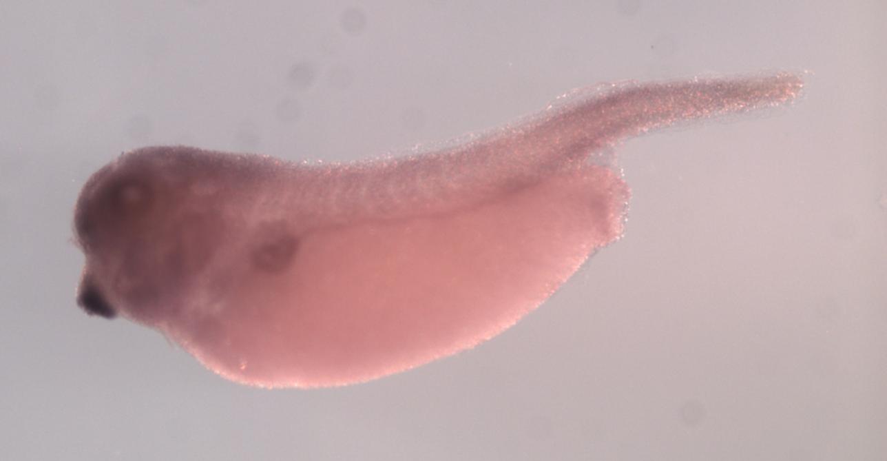 Larger Image apmap (adipocyte plasma membrane associated protein) gene expression in X. laevis embryo, assayed via in situ hybridization, NF stage 35 & 36, lateral view, anterior left, dorsal up. Copyright © Perron Lab