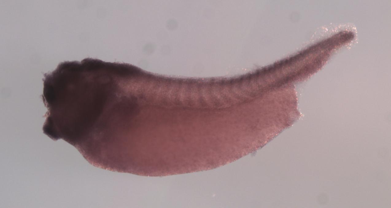 Larger Image cnp (2',3'-cyclic nucleotide 3' phosphodiesterase) gene expression in X. laevis embryo, assayed via in situ hybridization, NF stage 35 & 36, lateral view, anterior left, dorsal up. Copyright © Perron Lab