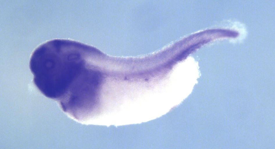 nemp1 (nuclear envelope integral membrane protein 1) gene expression in X. laevis embryo, assayed via in situ hybridization, NF stage 35 & 36, lateral view, anterior left, dorsal up.