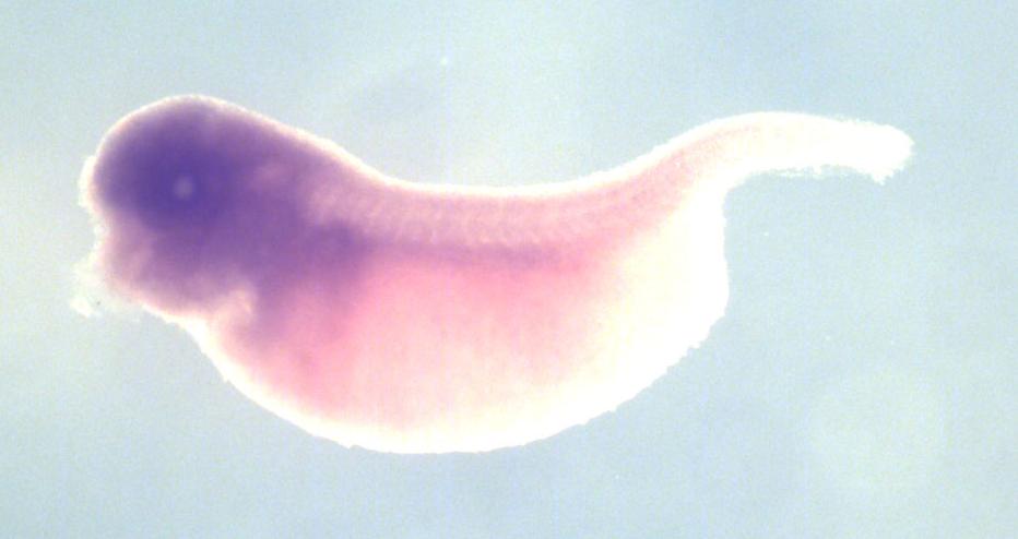 Larger Image palb2 (partner and localizer of BRCA2) gene expression in X. laevis embryo, assayed via in situ hybridization, NF stage 3 & 36, lateral view, anterior left, dorsal up. Copyright © Perron Lab