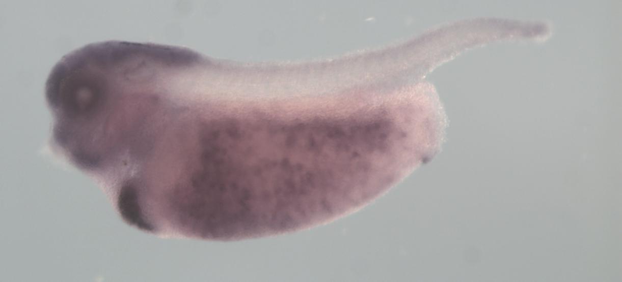 Larger Image prkacb (protein kinase cAMP-activated catalytic subunit beta) gene expression in X. laevis embryo, assayed via in situ hybridization, NF stage 35 & 36, lateral view, anterior left, dorsal up. Copyright © Perron Lab