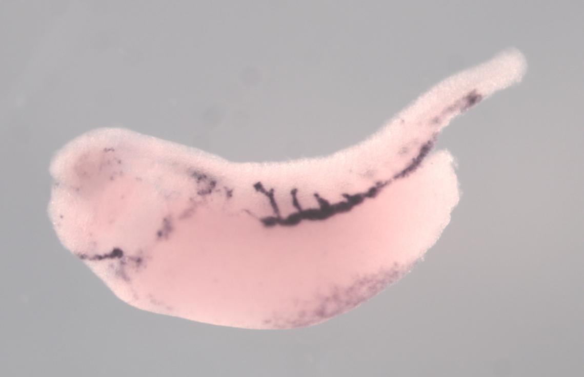 Larger Image ppp1r9a (protein phosphatase 1 regulatory subunit 9A) gene expression in X. laevis embryo, assayed via in situ hybridization, NF stage 35 & 36, lateral view, anterior left, dorsal up. Copyright © Perron Lab