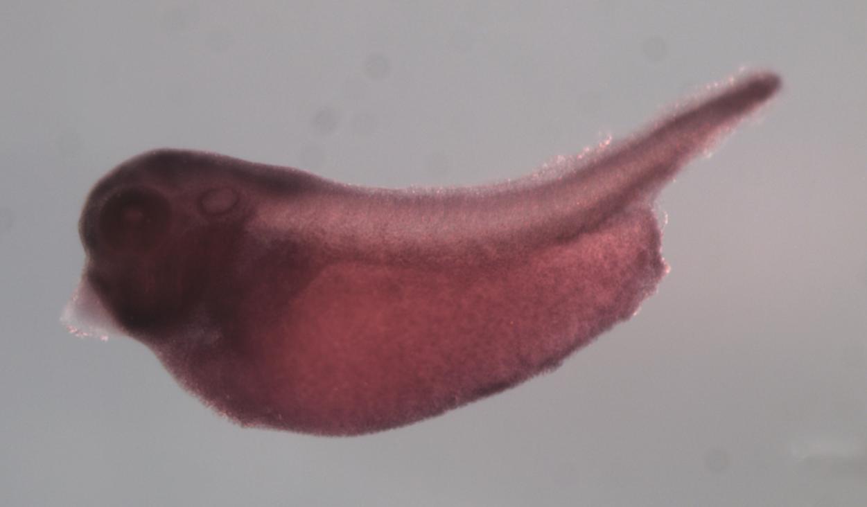 scarf2 (scavenger receptor class F member 2) gene expression in X. laevis embryo, assayed via in situ hybridization, NF stage 35 & 36, lateral view, anterior left, dorsal up.