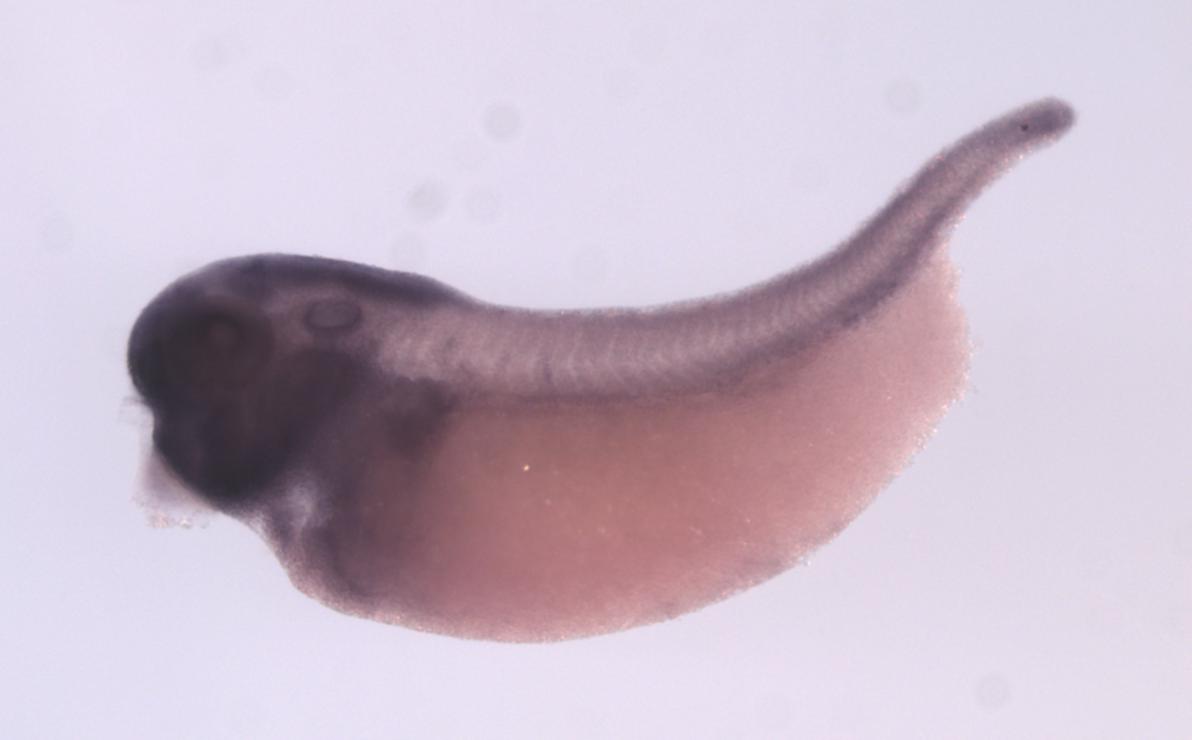 Larger Image echdc2 (enoyl-CoA hydratase domain containing 2) gene expression in X. laevis embryo, assayed via in situ hybridization, NF stage 35 & 36, lateral view, anterior left, dorsal up. Copyright © Perron Lab