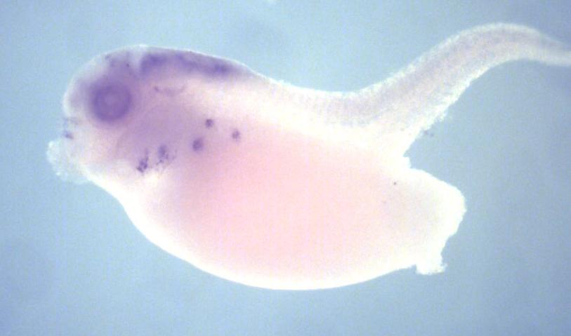 Larger Image drc1 (dynein regulatory complex subunit 1) gene expression in X. laevis embryo, assayed via in situ hybridization, NF stage 35 & 36, lateral view, anterior left, dorsal up. Copyright © Perron Lab