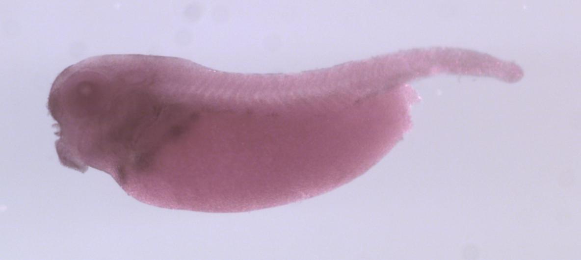 Larger Image msmb.3 (microseminoprotein, beta-, gene 3) gene expression in X. laevis embryo, assayed via in situ hybridization, NF stage 35 & 36, lateral view, anterior left, dorsal up. Copyright © Perron Lab
