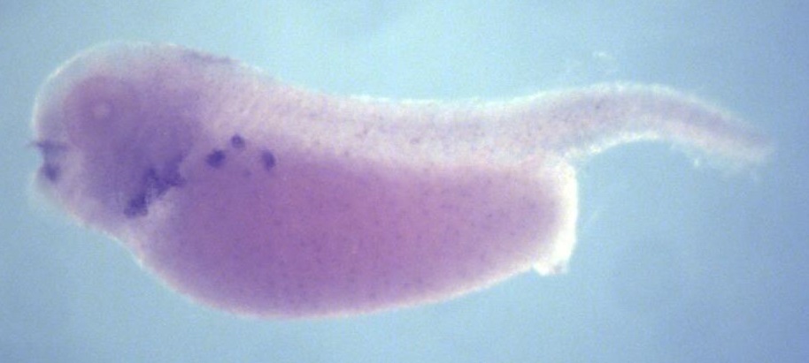 Larger Image irag2 (inositol 1,4,5-triphosphate receptor associated 2) gene expression in X. laevis embryo, assayed via in situ hybridization, NF stage 35 & 36, lateral view, anterior left, dorsal up. Copyright © Perron Lab
