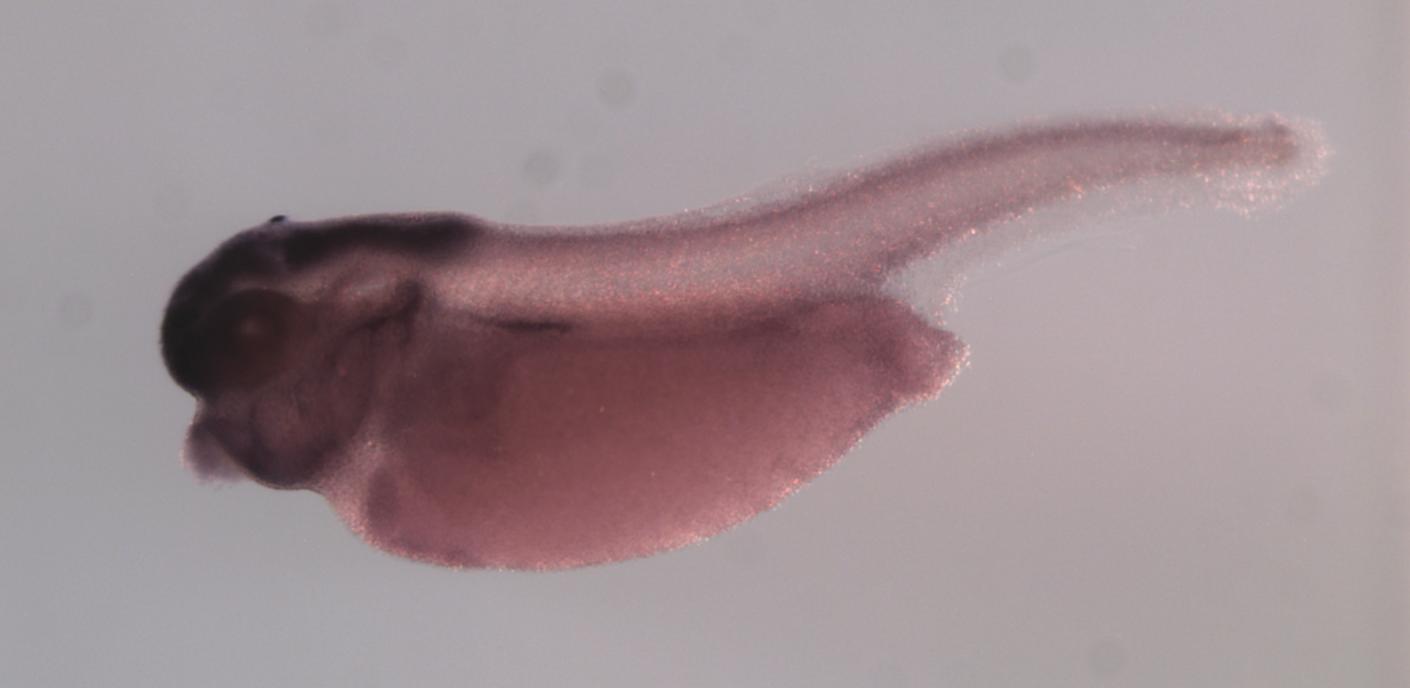 Larger Image dbn1 (drebrin 1) gene expression in X. laevis embryo, assayed via in situ hybridization, NF stage 35 & 36, lateral view, anterior left, dorsal up. Copyright © Perron Lab