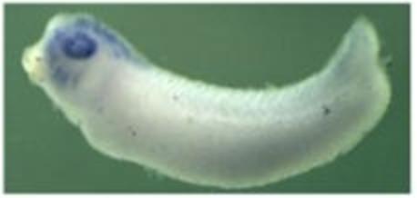 e2f1 (E2F transcription factor 1) gene expression in Xenopus laevis embryo, assayed via in situ hybridization, NF stage 26-32, lateral view, anterior left, dorsal up.