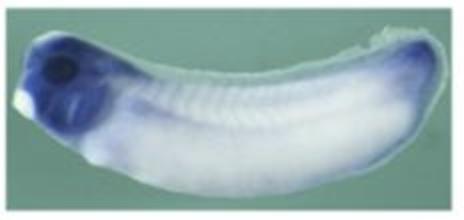 Larger Image rad21 (RAD21 cohesin complex component) gene expression in Xenopus laevis embryo, assayed via in situ hybridization, NF stage 26-32, lateral view, anterior left, dorsal up. This image is extracted from figure published in: Zhang Z et al. (2017) Copyright © 2017. Image reproduced with permission of the Publisher and the copyright holder. This is an Open Access article distributed under the terms of the Creative Commons Attribution License.