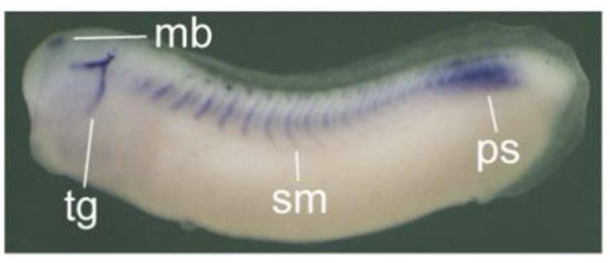 mcam (melanoma cell adhesion molecule) gene expression in Xenopus laevis embryo, assayed via in situ hybridization, NF stage 26-32, lateral view, anterior left, dorsal up.