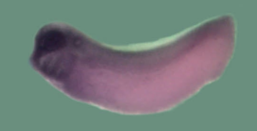 Larger Image wscd2 (WSC domain containing 2) gene expression in Xenopus laevis embryo, assayed via in situ hybridization, NF stage 29 & 30, lateral view, anterior left, dorsal up.
