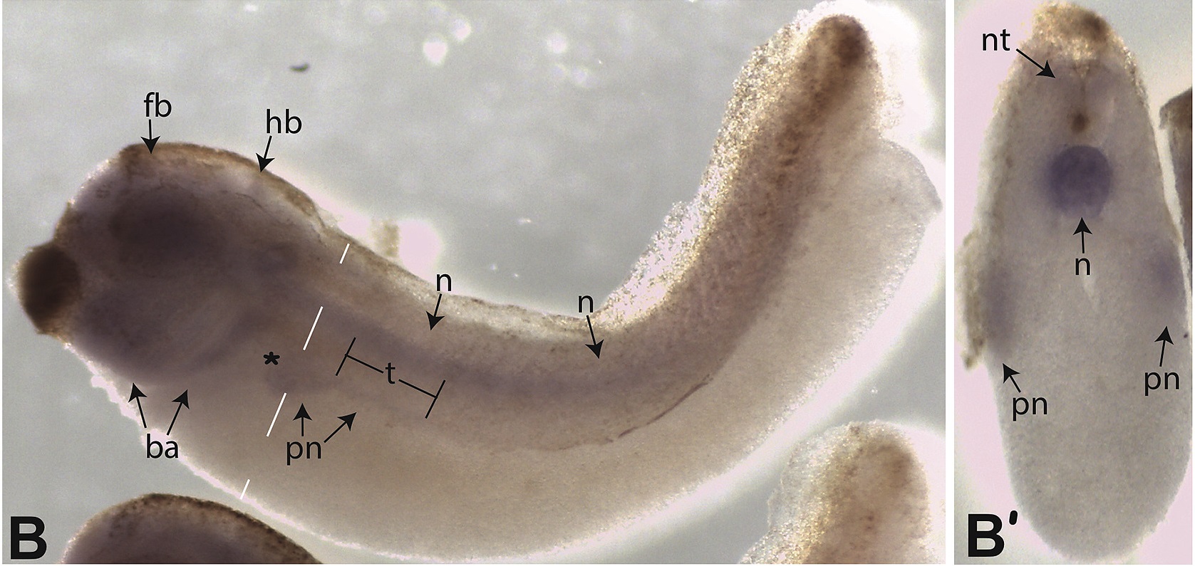 Larger Image gtpbp10 (GTP-binding protein 10 (putative)) gene expression in Xenopus laevis embryo, assayed via in situ hybridization, NF stage 36, lateral view, anterior left, dorsal up. This image is extracted from figure published in: Jerry R et al. (2019), Image published in: Jerry R et al. (2019) Copyright © 2019. Image reproduced with permission of the Publisher, Elsevier B. V.