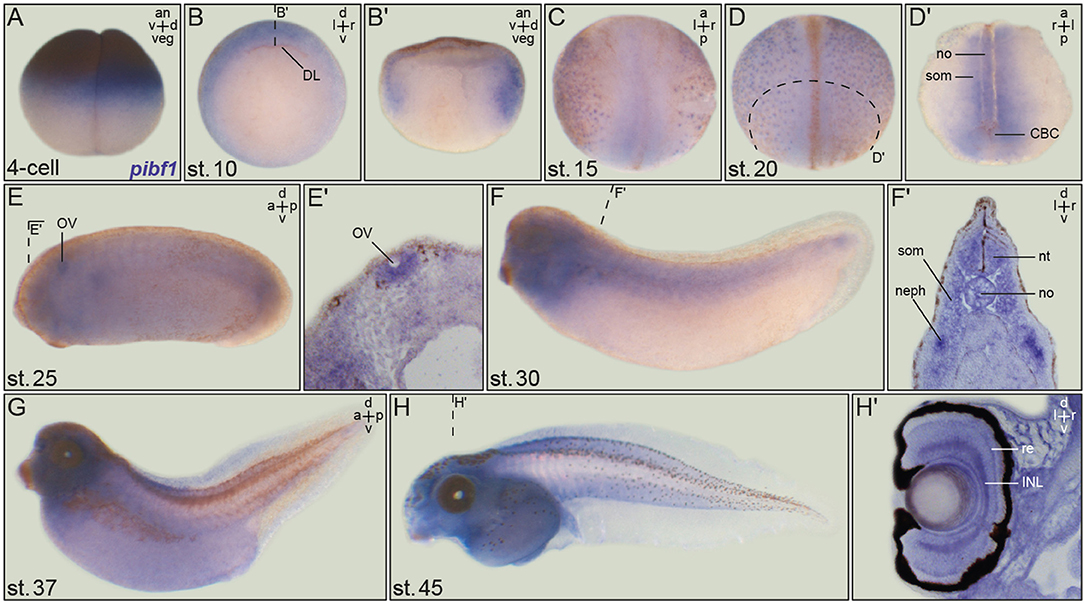 Figure 3. Embryonic pibf1 expression correlates with ciliated tissues. Embryos of defined stages were analyzed for pibf1 mRNA by whole-mount in situ hybridization using a digoxigenin-labeled antisense probe. (A) Maternal transcripts in the animal hemisphere of the 4-cell embryo. (B) Expression in the involuting marginal zone tissue of the early gastrula embryo. (C) Staining of pibf1 in the axial and paraxial mesoderm at early neurula stages. (D) Pibf1 signals in skin MCCs and axial/paraxial mesoderm. (E) Expression in the otic vesicle at stage 25. (F–H) Expression pattern in tadpoles, including the head region, somites, and nephrostomes. Histological section of the eye (H′) revealed signals in the retina as well as the inner nuclear cell layer. Planes of histological sections in (B′,D′,E′,F′,H′) are indicated in the respective panels. an, animal; a, anterior; d, dorsal; DL, dorsal lip; INL, inner nuclear layer; l, left; neph, nephrostomes; no, notochord; nt, neural tube; ov, otic vesicle; p, posterior; r, right; re, retina; som, somite; v, ventral; veg, vegetal.
