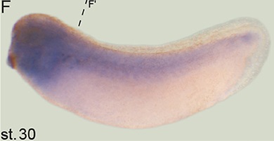 Larger Image pibf1 (progesterone immunomodulatory binding factor 1) gene expression in Xenopus laevis embryo, assayed via in situ hybridization, NF stage 30, lateral view, anterior left, dorsal up. This image is extracted from figure published in: Ott T et al. (2019), Image published in: Ott T et al. (2019) Copyright © 2019 Ott, Kaufmann, Granzow, Hinderhofer, Bartram, Theiß, Seitz, Paramasivam, Schulz, Moog, Blum and Evers. Creative Commons Attribution license