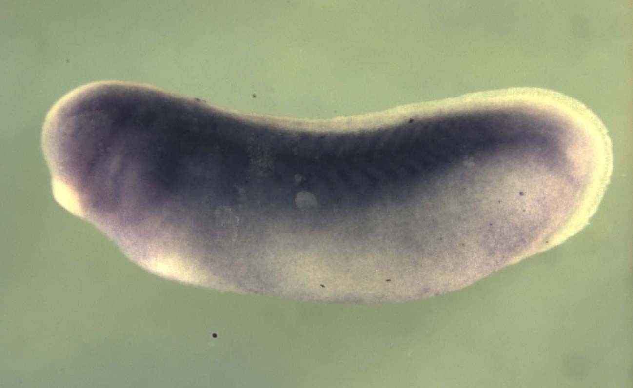 Larger Image disp1 (dispatched homolog 1) expressed in Xenopus laevis embryo via in situ hybridization, NF stage 27, lateral view, anterior left. Image copyrighted by © XDB3 Copyright © XDB3