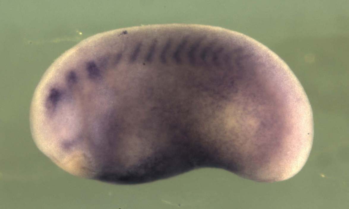 map3k8 gene expression in Xenopus laevis, NF stage 20 embryo, in situ hybridization, lateral view, anterior left.