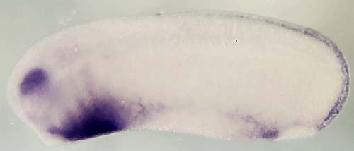 Larger Image bambi (BMP and activin membrane-bound inhibitor) gene expression in Xenopus tropicalis embryo, assayed via in situ hybridization, NF stage 26, lateral view, anterior left, dorsal up. Copyright © Harland lab in situ screen