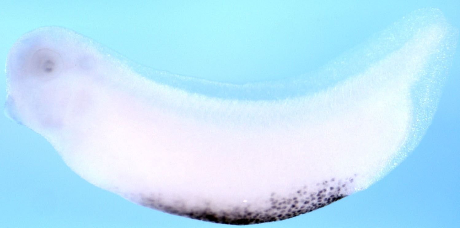 Larger Image szl (sizzled) gene expression in Xenopus laevis embryo via in situ hybridization, NF stage 32, lateral view, dorsal up, anterior left. Copyright © Zorn Lab