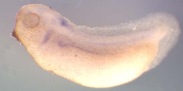 Larger Image hoxb3 (homeobox B3) gene expression in Xenopus tropicalis embryos, NF stage 28, as assayed by in situ hybridization, lateral view, anterior left, dorsal up. Copyright © Papalopulu Lab