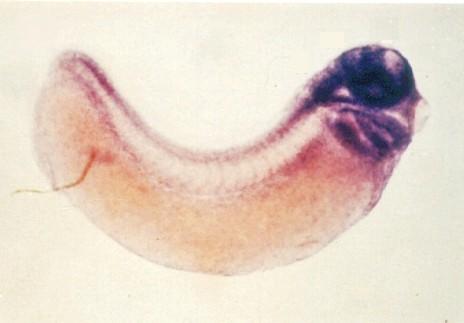 Larger Image pou2f1 (POU domain, class 2, transcription factor 1) expression in Xenopus laevis embryo, NF stage 28, lateral view, anterior right, dorsal up. Image published in: Veenstra GJ et al. (1995) Copyright © 1995. Image reproduced with permission of the Publisher, Elsevier B. V.