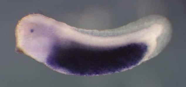Larger Image apoa1 (apolipoprotein A-I) gene expression in Xenopus tropicalis embryo, NF stage 28 embryo, lateral view, anterior left, dorsal up. Copyright © Papalopulu Lab