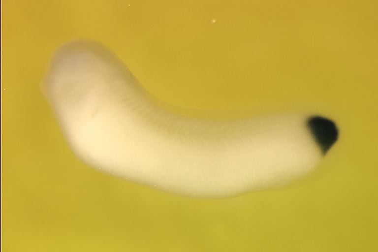 Larger Image msgn1 (Mesogenin1) gene expression in Xenopus laevis embryo via in situ hybridization, NF stage 28, lateral view, anterior left, dorsal up. Image copyrighted by: Pollet, Nicolas. Copyright © CNRS UMR 8080, Nicolas Pollet, , 2005 This image is extracted from figure published in: Pollet N et al. (2005), Image published in: AXELDB Database, AxelDB (Image Pages) Copyright © 2005. Image reproduced with permission of the Publisher, Elsevier B. V.