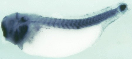 Larger Image spry4 (sprouty homolog 4) gene expression in Xenopus tropicalis, assayed by in situ hybridization, NF stage 35 & 36 embryo, lateral view, anterior left, dorsal up. Copyright © Harland Lab