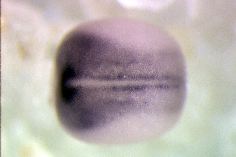 rcor2 gene expression in Xenopus laevis, NF stage 13 embryo, in situ hybridization, dorsal view, anterior left. Copyrighted by Pollet, Nicolas
