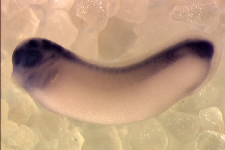 Larger Image hes6 (hairy and enhancer of split 6, gene 1) gene expression in a X. laevis embryo, NF stage 28, assayed via in situ hybridization, lateral view, anterior left, dorsal up. Copyright © CNRS UMR 8080, Nicolas Pollet Image published in: AXELDB Database, AxelDB (Image Pages)