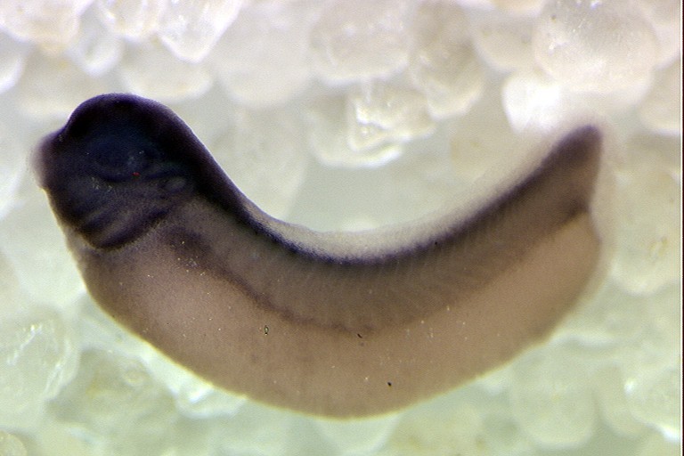 gnb1 gene expression in Xenopus laevis embryo via in situ hybridization, NF stage 29 & 30, lateral view, anterior left.