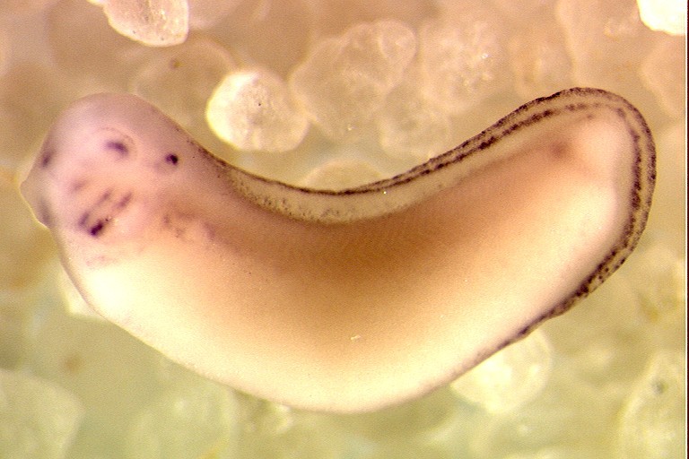 Larger Image dkk1 (didickkopf WNT signaling pathway inhibitor 1) gene expression in Xenopus laevis embryo, assayed via in situ hybridization, NF stage 28 lateral view, anterior left, dorsal up. Copyright © CNRS UMR 8080, Nicolas Pollet Image published in: AXELDB Database, AxelDB (Image Pages)