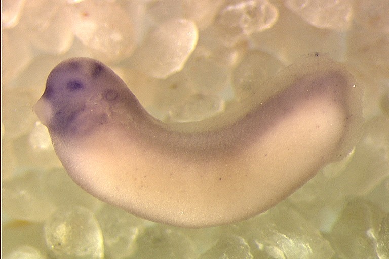 klhdc4 gene expression in Xenopus laevis embryo via in situ hybridization, NF stage 28, lateral view, anterior left.