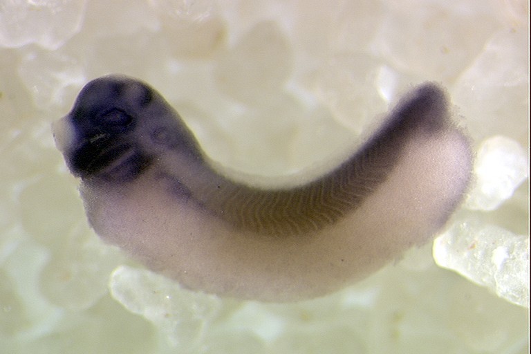 nop58 gene expression in Xenopus laevis embryo via in situ hybridization, NF stage 29 & 30, lateral view, anterior left.
