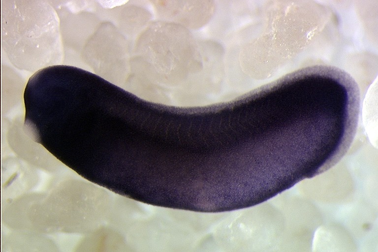 hnrnpab (heterogeneous nuclear ribonucleoprotein A/B) expressed in Xenopus laevis embryo via in situ hybridization, NF stage 28, lateral view, anterior left. Image copyrighted by © CNRS UMR 8080, Nicolas Pollet