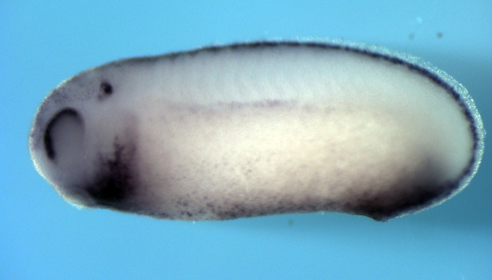 Larger Image bmp4 bone morphogenetic protein 4) gene expression in Xenopus laevis embryo via in situ hybridization, NF stage 26, lateral view, anterior left. Copyright © Zorn Lab