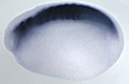 twsg1 (twisted gastrulation homolog 1) gene expression in Xenopus tropicalis, assayed by in situ hybridization, NF stage 22 embryo, lateral view, anterior left, dorsal up. Image from Harland laboratory in situ library: http://tropicalis.berkeley.edu/home/gene_expression/insitugallery/pages/twsg1-AL634092-28.html