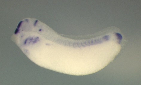 Larger Image fgf8 (fibroblast growth factor 8 (androgen-induced)) gene expression in Xenopus tropicalis embryo, assayed via in situ hybridization, NF stage 28, lateral view, anterior left, dorsal up. This image is extracted from figure published in: Lea R et al. (2009), Image published in: Lea R et al. (2009) Copyright © 2009. Image reproduced with permission of the Publisher, John Wiley & Sons.