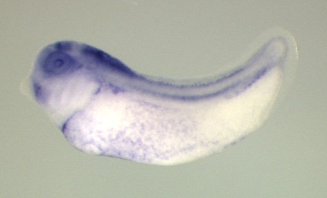 Larger Image fgfr3 (fibroblast growth factor receptor 3 (achondroplasia, thanatophoric dwarfism)) expression in Xenopus tropicalis embryo, assayed via insitu hybridization, NF stage 35 & 36, lateral view, anterior left, dorsal up. This image is extracted from figure published in: Lea R et al. (2009), Image published in: Lea R et al. (2009) Copyright © 2009. Image reproduced with permission of the Publisher, John Wiley & Sons.