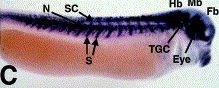 Larger Image ptprs (protein tyrosine phosphatase receptor type S) gene expression in X. laevis, NF stage 28,asayed via in situ hybridization, lateral view, anterior right, dorsal up. Key: N=notochord; SC= spinal cord; Hb= hindbrain; Mb= midbrain; Fb= forebrain; TGc= trigeminal ganglion; S= somites., Eye=eye. This image is extracted from figure published in: Johnson KG and Holt CE (2000), Image published in: Johnson KG and Holt CE (2000) Copyright © 2000. Image reproduced with permission of the Publisher, Elsevier B. V.