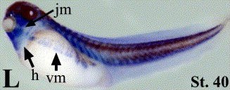 Larger Image tn3 (titin novex-3) gene expression in Xenopus laevis embryos, NF stage 40, as assayed by in situ hybridization, lateral view, anterior left, dorsal up. Key: jm=jaw muscle, h=heart; vm=ventral myoblasts, also called hypaxial muscles. This image is extracted from figure published in: Brown DD et al. (2006), Image published in: Brown DD et al. (2006) Copyright © 2006. Image reproduced with permission of the Publisher, Elsevier B. V.